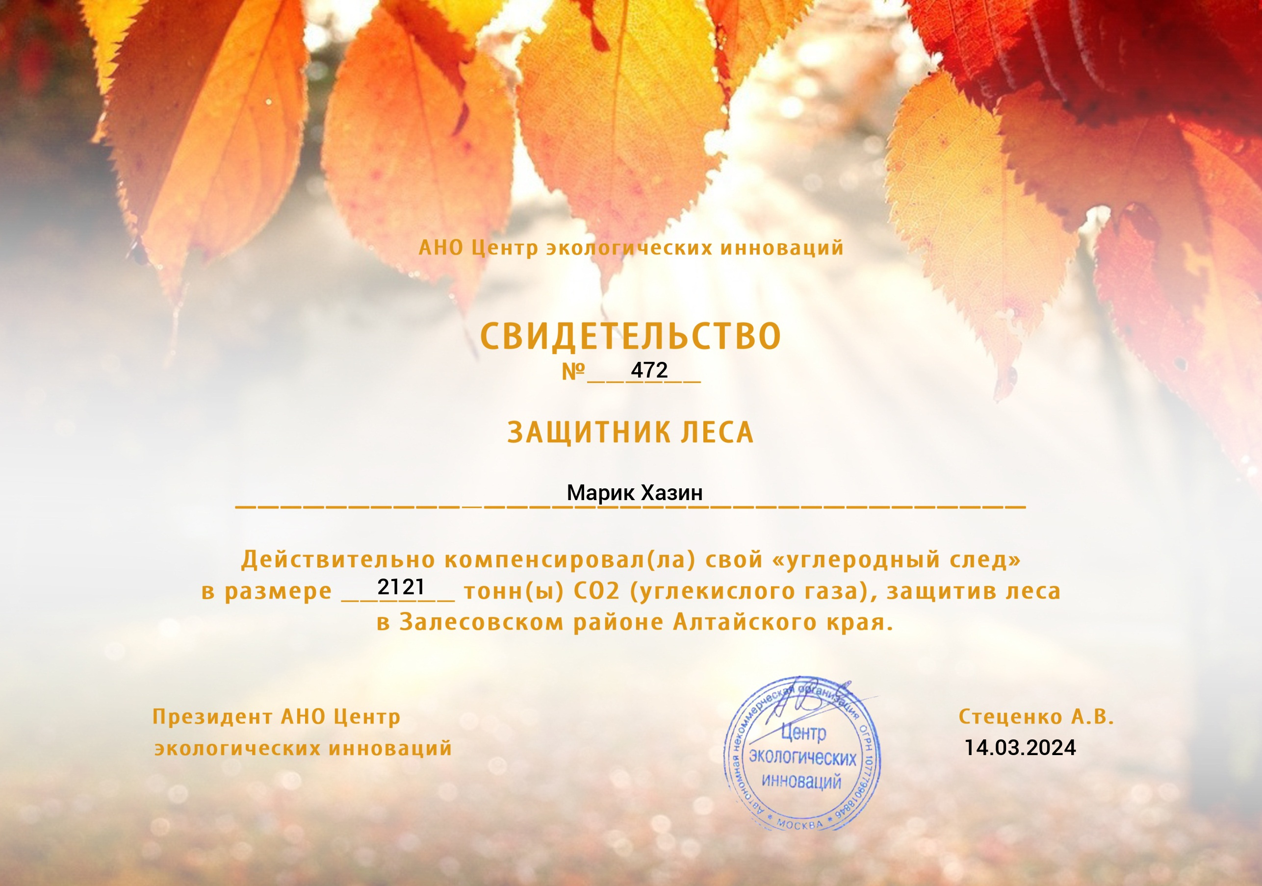 Марик Хазин погасил(а) углеродный след